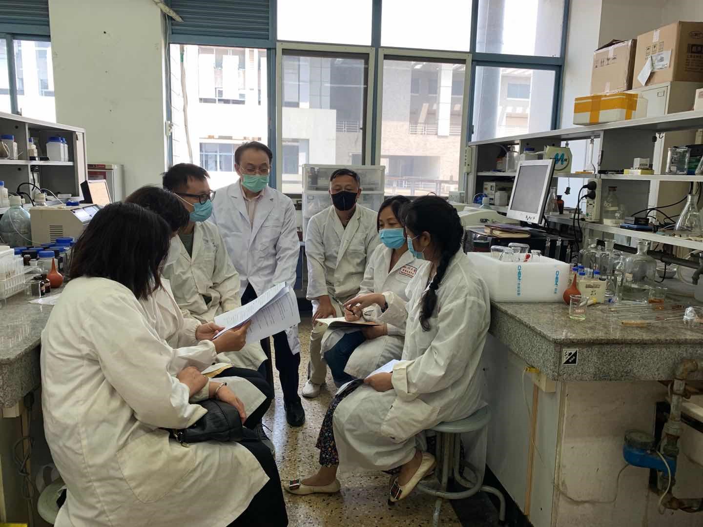 分析化学教研室的李永生、吕莉、章洁、谭光群、王春玲、王彬及赵忠俊老师正在讨论实验方案
