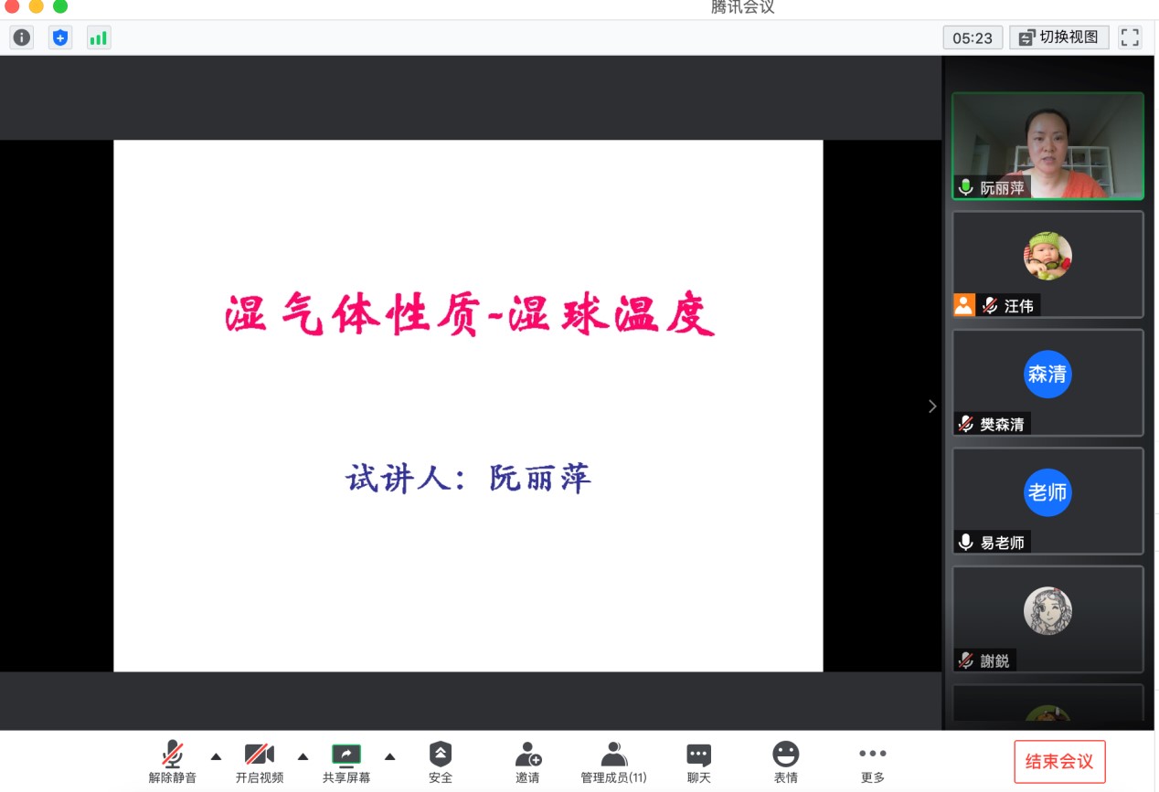 首先,教研室新进教师阮丽萍老师进行了课程内容的试讲。新进教师在正式授课前,需要进行一年的跟课学习,再顺利通过试讲后,方可正式承担课程。该制度一直是化工原理教研室的优良传统,旨在通过以经验丰富的教师带新教师的方式,进一步提升新进教师的教学业务水平。阮老师在本次教研活动中对“湿气体性质-湿球温度“的章节内容进行了试讲,获得了教研室老师们的一致好评。同时,易美桂老师、叶世超老师、杨雪峰老师等在阮老师所讲内容上进一步对课程知识点展开深入讨论,为年轻老师带来了独特的观点和深刻的启发。