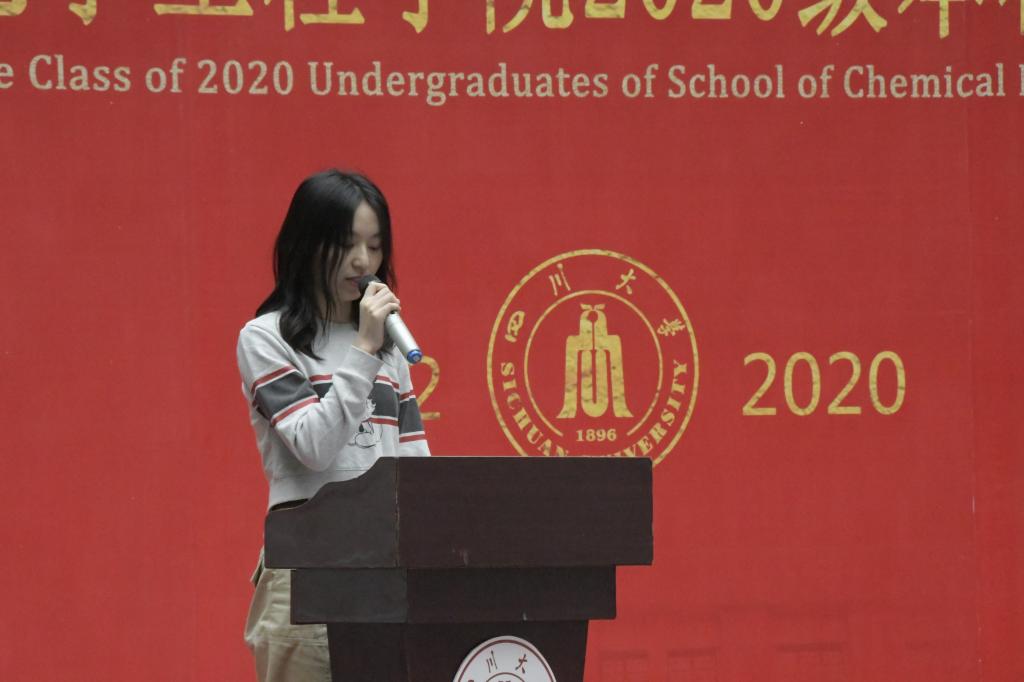 2017级徐钰萱同学与学弟学妹分享了自己川大三年的学习和生活,激励同学们要敢于挑战未知,在学好专业知识的同时,也要不断提高自身的综合实力,做到学有所成,学有所得;2020级新生代表张耘陌同学表示进入川大、进入化工学院,是人生中一个新的开始,他会珍惜当下,保持自律,在新的征程中“以梦为马,不负韶华”!