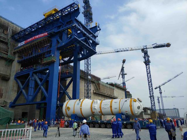 2017年11月10日,在福建福清,由张富源率团队研究设计的蒸汽发生器在“华龙一号”首堆工程进行吊装作业(资料照片)。新华社发