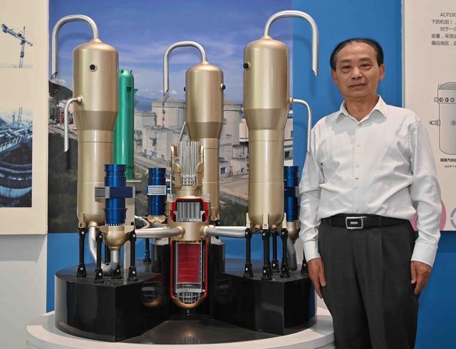 2月5日,在四川成都,张富源与自己领军研究设计的“华龙一号”ZH—65型蒸汽发生器模型合影。新华社记者 刘坤 摄