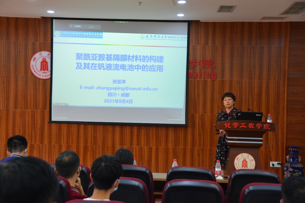 2021年8月4日下午,西南科技大学张亚萍教授应ballbet贝博官方网站膜科学与功能材料研究室邀请,在望江校区化工学院313会议室进行了题为“聚酰亚胺基隔膜材料的构建及其在钒液流电池中的应用”的特邀学术报告,本次报告会由谢锐教授主持,bb贝博艾弗森官方网站和轻工科学与工程学院等50余名师生参加。