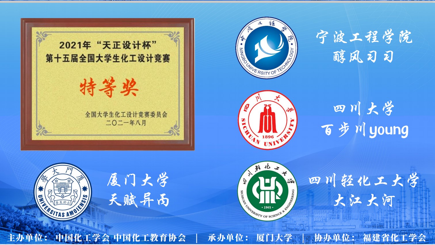 2021年“天正设计杯”第十五届全国老员工化工设计竞赛全国总决赛于8月16日~8月22日在线上举办,由厦门大学承办。经过初赛、赛区决赛,西南赛区、华北赛区等七个赛区共60支队伍突出重围,进入全国总决赛,参与最终角逐。受新冠肺炎疫情影响,今年全国总决赛专项评审、答辩环节采用线上的方式进行,经过专项评审、第一轮答辩、第二轮答辩,“百步川young”团队不惧强敌,凭借饱满的工作量、高质量的设计作品、清晰流畅的现场答辩,以0.1分的微小差距惜败于浙江大学,排名全国第四名,并获得了全国特等奖的殊荣。本次竞赛,bb贝博艾弗森官方网站共获得全国特等奖一项、全国二等奖一项、全国三等奖六项及西南赛区金奖等奖项。