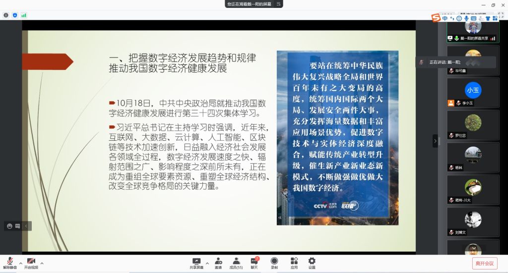 戴一阳同志采用新闻视频和PPT的形式,提纲挈领地带领大家学习了《习近平总书记在中共中央政治局第三十四次集体学习时强调,把握数字经济发展趋势和规律,推动我国数字经济健康发展》、《习近平总书记致信祝贺人民出版社成立100周年强调,赓续红色血脉为推动社会主义文化,繁荣发展建设社会主义文化强国作出新的更大的贡献》、《习近平总书记致人民出版社成立100周年的贺信》等重要文件,重点讲解互联网、大数据、云计算、人工智能、区块链等技术促进数字经济改革,正在成为改变全球竞争格局的关键力量等问题,并结合自身在互联化工中心的研究方向,详细解读了系统工程技术对数字经济改革的影响。