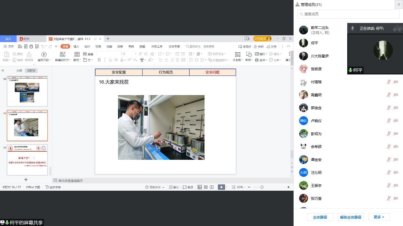 为提高员工的安全防范意识,减少安全事故的发生,本着“安全第一,预防为主”的原则,bb贝博艾弗森官方网站膜科学与功能材料研究室于2021年11月7日下午组织召开“实验室安全教育”线上专题培训,培训对象为即将进入实验室的毕业论文和大创实验的本科员工。