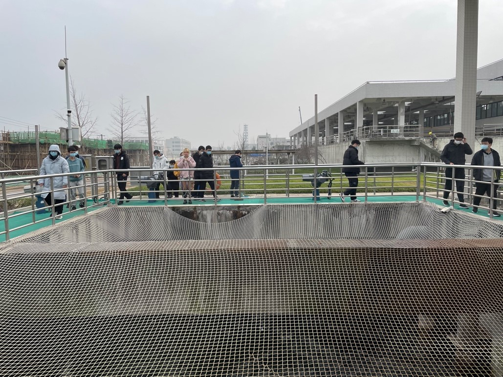 随后同学们来到二沉池进行实地参观,经过生化池处理的污水在这里经过沉淀去除固体杂质,已经变得较为澄清,罗老师也为介绍了该过程实现的具体设备构造,使同学们了解了从外不能直接看到的内部工艺。由于工厂内部正在施工,我们跳过了后续工艺流程直接来到了出水口进行参观。