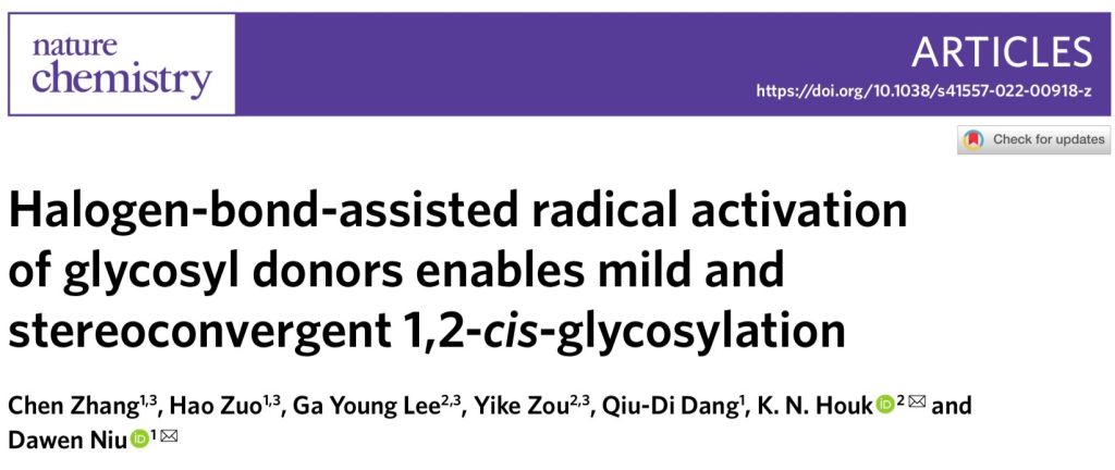 北京时间2022年4月11日晚23时,公司钮大文教授团队与加州大学洛杉矶分校Houk团队合作在Nature Chemistry上发表了一篇题为“Halogen-bond-assisted radical activation of glycosyl donors enables mild and stereoconvergent 1,2-cis-glycosylation”的研究工作[1]。公司制药与生物工程系博士生左昊同学(化工学院本硕博)为文章共同第一作者。