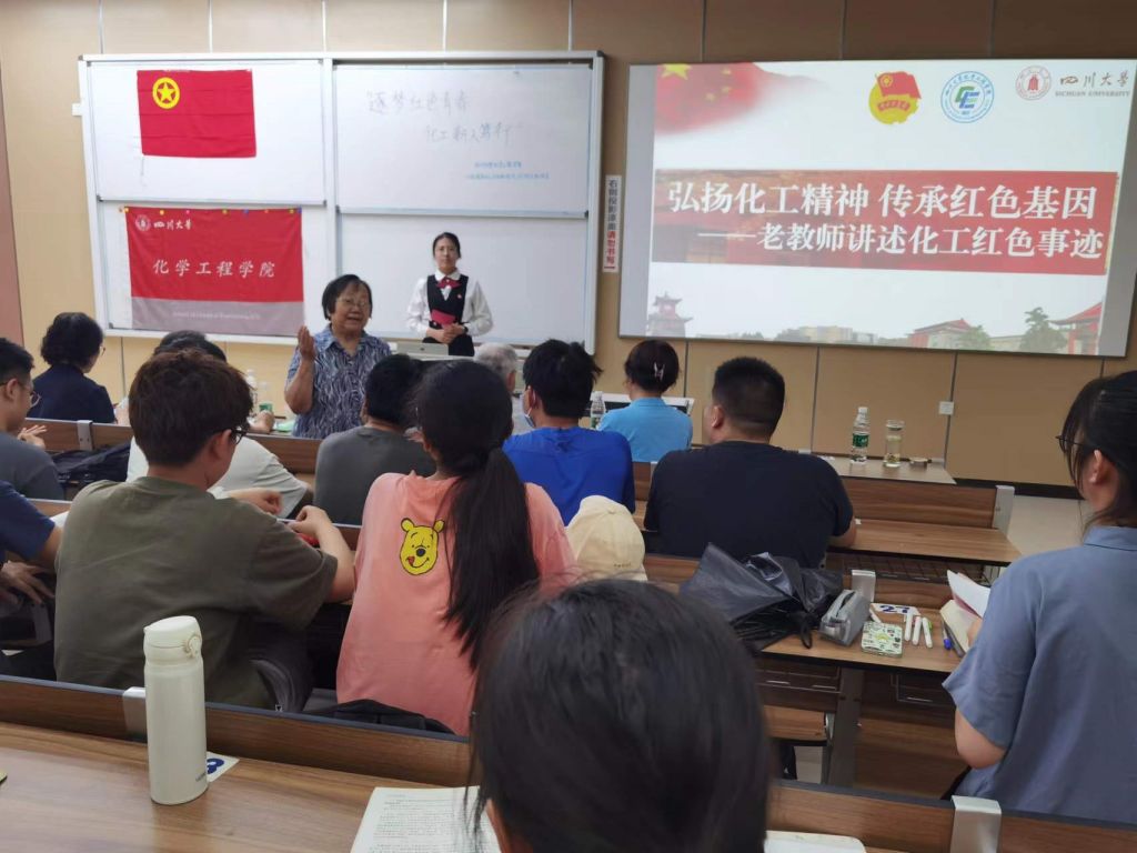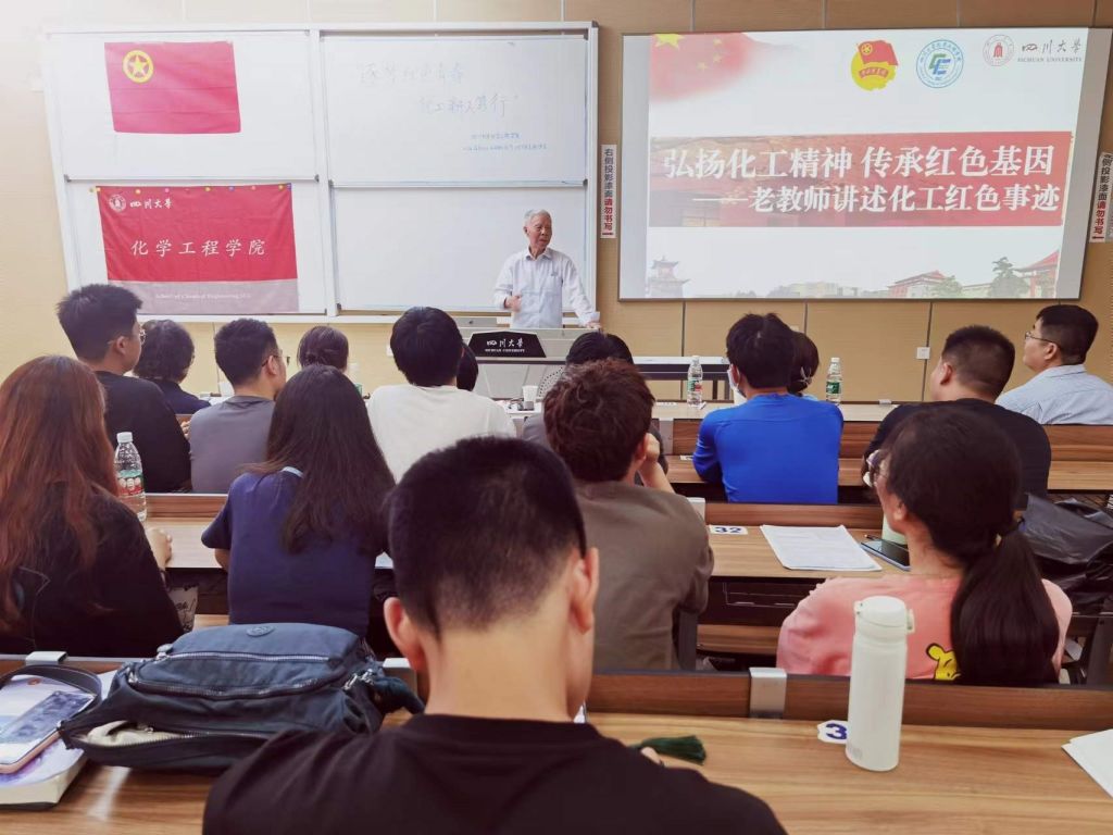 按照流程,首先邀请梁明征老师上台讲述他所听所见的化工红色事迹。梁明征老师带大家回顾了川大化工学院的历史根源,梳理了川大化工学院的前身和发展历程。随后梁明征老师为大家介绍了川大的优秀员工,同时也是杰出的革命战士毛英才的事迹,他为反抗压迫与敌人斗智斗勇的事迹令人动容。此外梁明征老师还提到了王方定,张富源等川大杰出员工,突出介绍了他们在各自领域取得的傲人成绩,并勉励在座的各位同学奋发向上,争做优秀的川大学子。