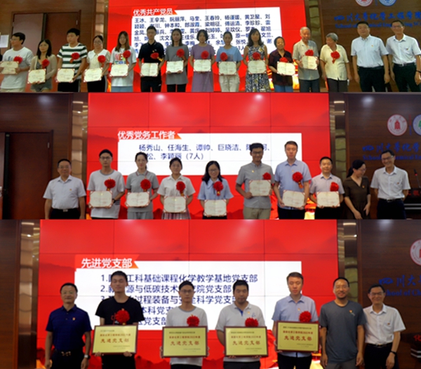 前排就座领导分别为“优秀共产党员”、“优秀党务工作者”和“先进党支部”代表颁奖。