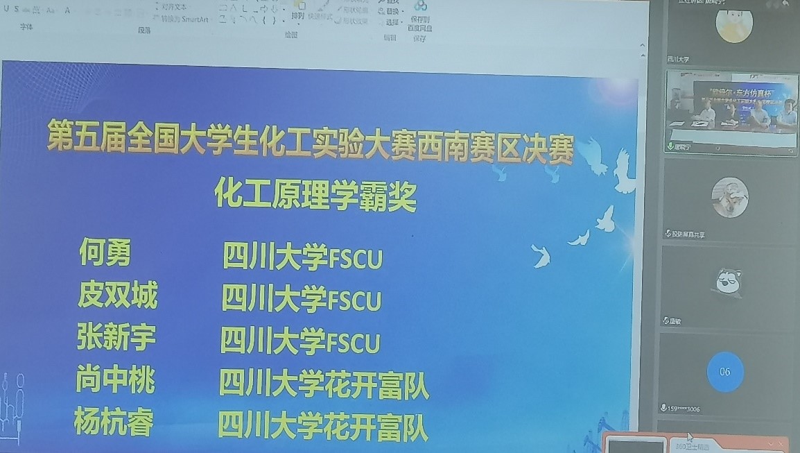 受疫情影响,本届西南赛区决赛改变以往的赛制模式,全程均通过网络平台进行线上比赛。入围赛区决赛的64支队伍先通过线上理论和仿真考试,根据这两项成绩排列团队成绩,按每所高校进入实操环节的队伍不超过2支的规定,遴选出32支队伍再进行远程实操考试。面对赛制的不断变化,指导教师和参赛队员们放弃休息时间,克服高温酷暑天气,认真备赛。在赛区决赛的理论和仿真考试环节,公司入围赛区决赛的4支队伍均取得了较好的成绩,团队成绩排名第一、二、三、六名;但由于赛制限制,只有前两名队伍进入远程实操考试。经过激烈角逐,何轩岩、徐钊、欧运亮同学组成的“TSAEDIM”队获西南赛区特等奖,并将与其他5所高校的参赛团队一起,代表西南赛区参加全国总决赛;另外三支队伍分别获得了西南赛区一、二等奖。此外,本次赛区决赛化工原理学霸奖5名全部由公司参赛同学获得,同时参赛同学还获得化工原理仿真比赛奖1项、化工原理实验团队奖1项。