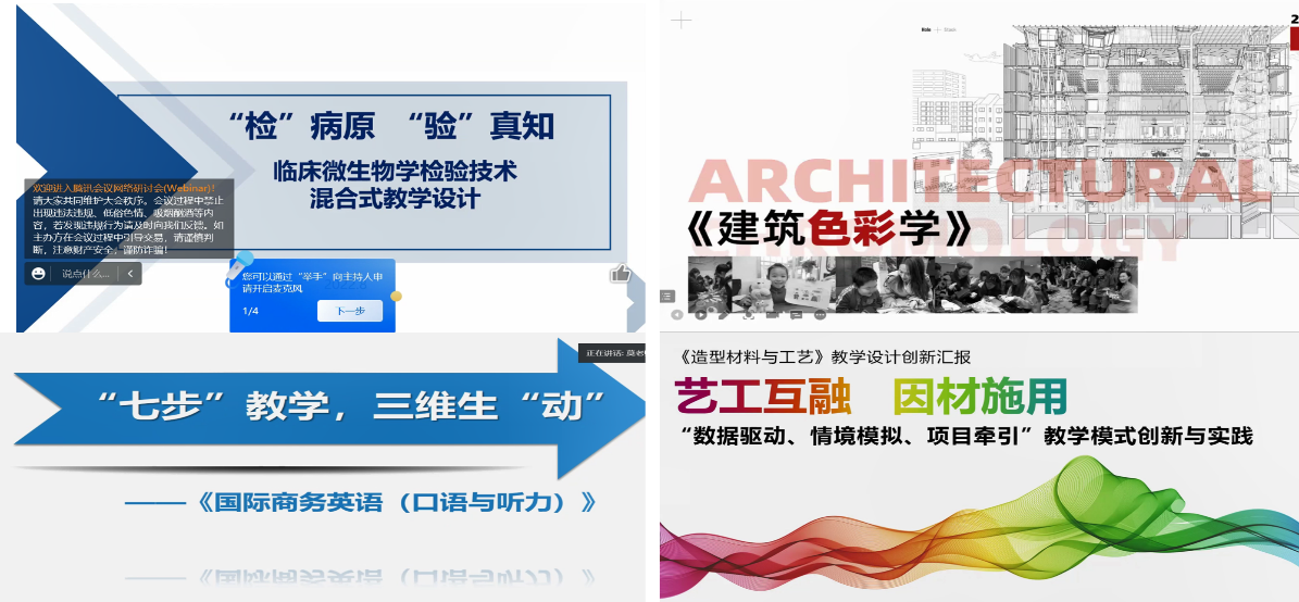 随后由陶传敏老师组黄曦悦老师、黄茜老师、莫群俐老师和张增强老师依次分享了《临床微生物学检验技术》、《建筑色彩学》、《国际商务英语(口语与听力)》和《造型材料与工艺》的课程混合式设计思路及建设经验,由点评专家逐一进行点评,并根据此次“混合式教学设计赛”的评分要点,就说课组织、混合式比赛特点、微课制作及教学活动设计、教研与实践的混合式教学等方面进行了指导,最后自由讨论环节,同参会老师就如何凝练说课内容和混合式教员工态社区的构建进行了探讨。