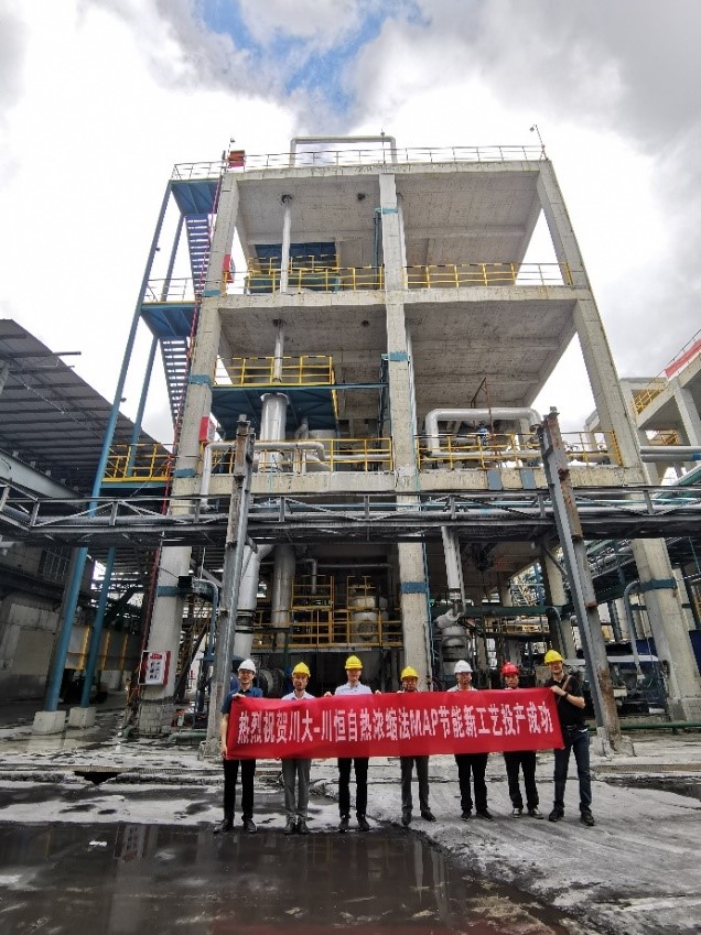 当前我国工业经济进入转型升级高质量发展期,能源与环境因素严重制约基础化工产业发展。MAP产业也不例外,浓缩、干燥能耗及排放问题首当其冲。川大-川恒绿色化工技术研发中心坚持“节能带动、减排增效”一举两得的技术创新路线,追求经济与社会“两个效益双提高”。朱家骅教授课题组在国家“863”计划(2006AA05Z235)课题成果及中国石油和化学工业协会科技进步一等奖“低温磷酸预浓缩法MAP节能新工艺”技术基础上开发的“自热浓缩法MAP节能新工艺”,在贵州川恒首次实现湿法磷酸反应自热浓缩制MAP料浆(固含量75%)。同时利用浓缩尾气余热两效闪蒸净化废水实现零排放,不仅免用蒸汽锅炉、而且在不增加总能耗前提下使原生产装置效率提高50%,这将为我国MAP产业带来新一代技术革命。
