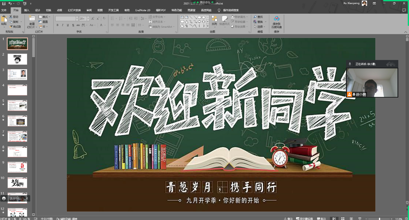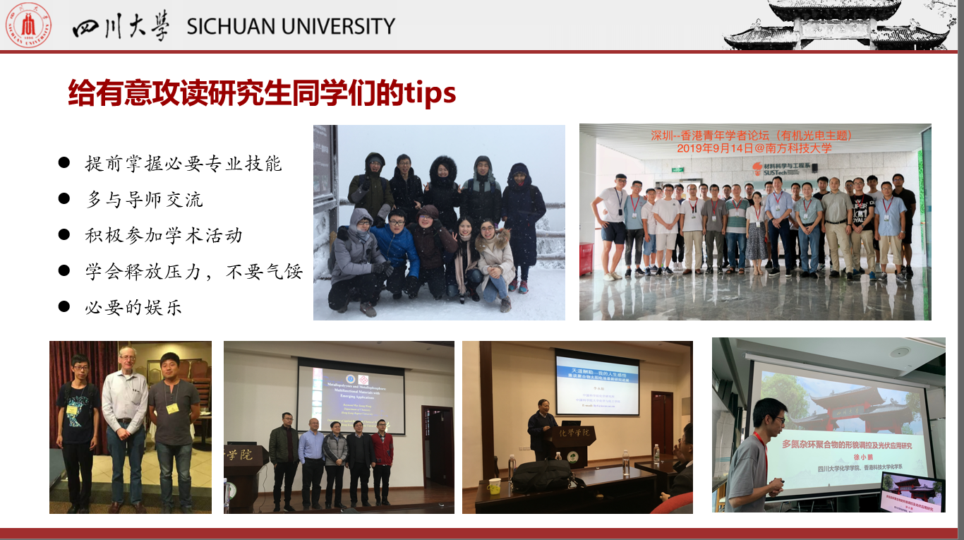 首先,徐老师以川大学长的身份与学弟学妹们分享了自己整个老员工涯及研究的心路历程。他图文结合讲述了自己初入大学的迷茫、对未来的困惑以及通过努力学习顺利考上研究生的大学时光,以自己的亲身经历激励新生学弟学妹们珍惜大学时光、刻苦钻研、绽放青春。随后又分享了读研期间所遇到的各种压力与挫折,讲述了在导师的指引下克服困难、刻苦研究,最终取得丰硕成果的研究生阶段,鼓励同学们学会面对挫折、克服困难、迎难而上、勇攀高峰,最终实现自我人生价值。