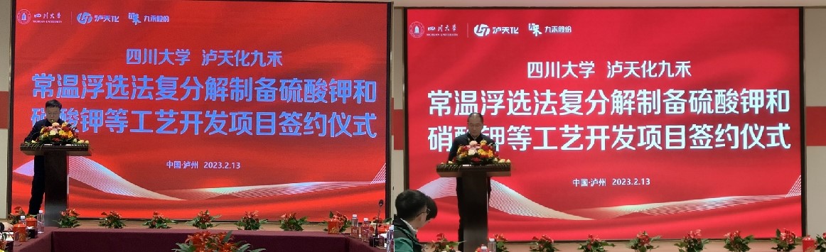 2023年2月13日下午,川大化工与九禾股份科研项目签约仪式在泸天化宾馆隆重举行。泸天化(集团)有限责任公司党委委员、常务副总经理傅利才,泸天化股份有限公司党委副书记、总经理赵永清,泸天化股份有限公司副总郭春建,泸天化(集团)有限责任公司总经理助理、九禾股份有限公司党委书记、董事长田军,九禾股份有限公司党委副书记、总经理冯学宁等公司领导,bb贝博艾弗森官方网站化工公司党委书记李天友,工程实验教学中心主任蒋炜教授,吴潘副主任,何坚特聘副研究员等出席签约仪式。