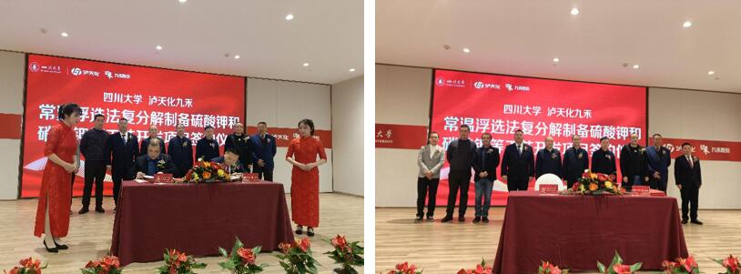 最后,蒋炜教授和九禾公司冯学宁总经理签署了《常温浮选法复分解制备硫酸钾和硝酸钾等工艺开发合作协议》。