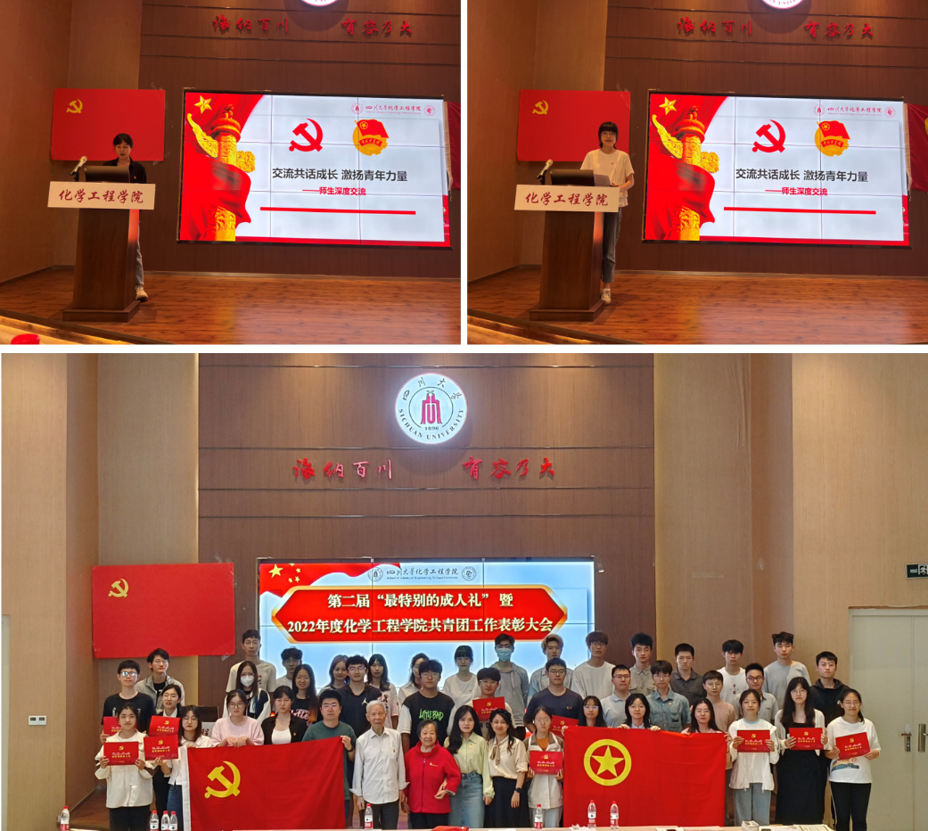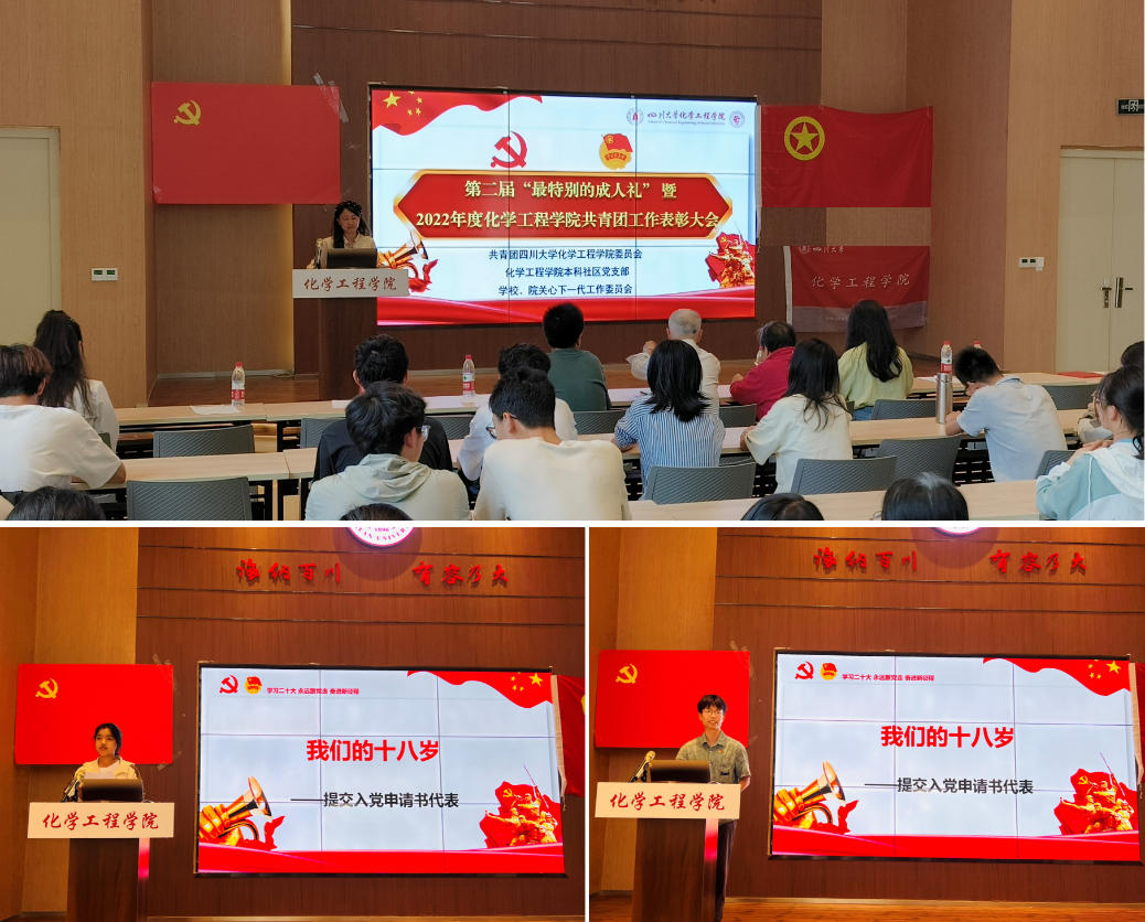 为深入学习贯彻党的二十大精神,树立典型、表彰先进,激励青年奋发向上、勇担使命,为筑牢化工团员使命担当,坚定理想信念,不断锤炼自身,矢志不移向党组织靠拢,ballbet贝博官方网站团委联合本科社区党支部,于5月27日在江安校区西园22舍报告厅隆重举办ballbet贝博官方网站第二届“最特别的成人礼”暨2022年度bb贝博艾弗森官方网站共青团工作表彰大会。校、院关工委梁明征老师、傅运清老师,学院团委书记李珍珍老师、辅导员付率老师、袁玲老师,2022年度学院共青团工作受表彰集体和个人代表,以及2022级团员代表等参与本次大会。