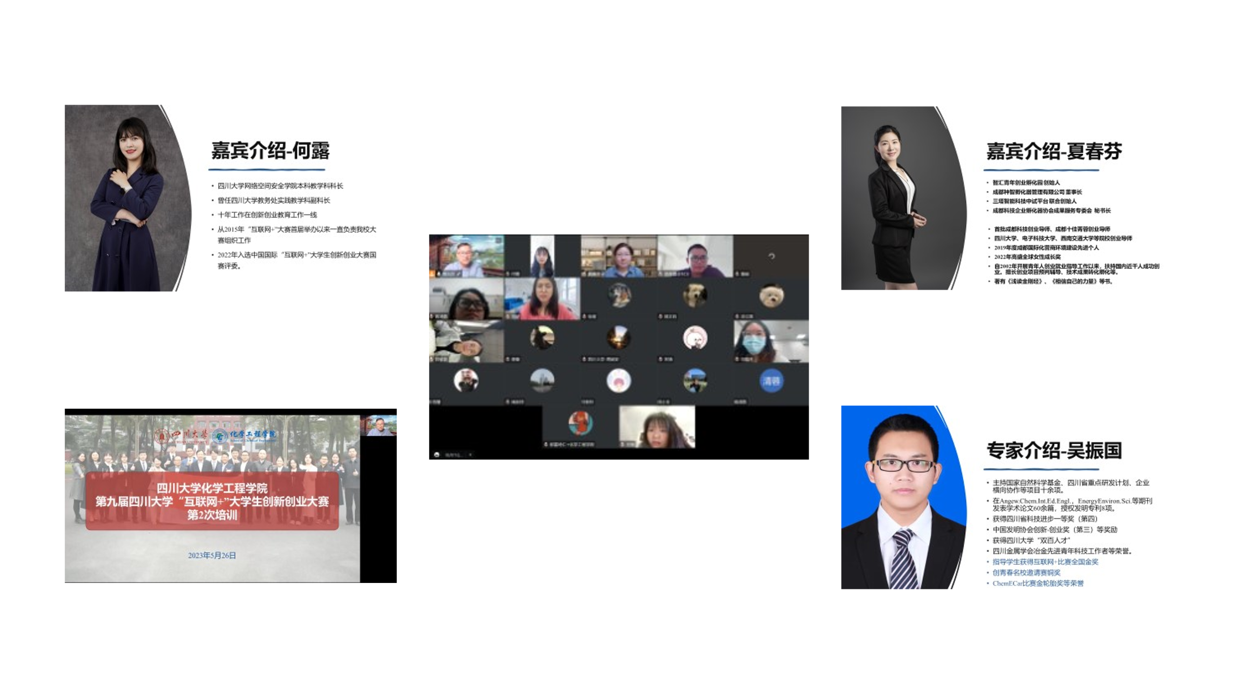 2023年5月26日9:00-11:30,ballbet贝博官方网站第九届“互联网+”老员工创新创业大赛第2轮培训顺利举行。培训采用腾讯会议线上的方式进行,共计7个项目近30余名师生参与,本次培训共邀请了3位专家对项目进行指导,分别是首批成都科技创业导师、成都十佳菁蓉创业导师、成都种智孵化器管理有限公司夏春芬董事长,具有近10年组织比赛经验的中国国际“互联网+”老员工创新创业大赛国赛评委何露老师,互联网+比赛全国金奖指导教师吴振国副教授。3位专家从对项目的内涵、成熟度、竞品策略、教育维度等方面进行了细致的现场指导和后续交流,鼓励各组从面向国家重大需求、解决民生问题,促进科教转化,服务地方经济发展等方面进一步提升,做好“互联网+”老员工创新创业大赛的备赛。