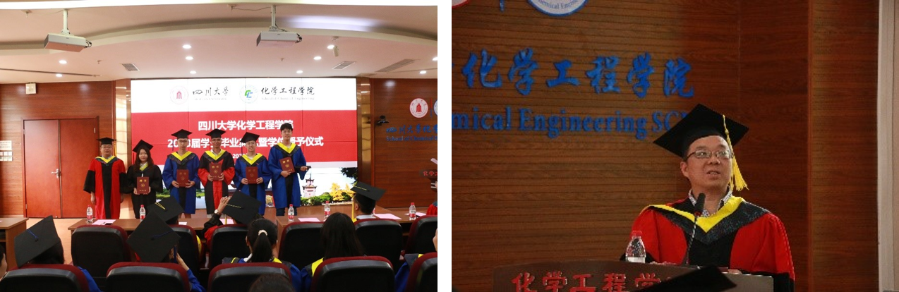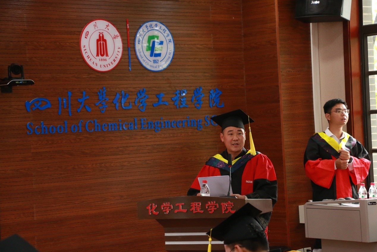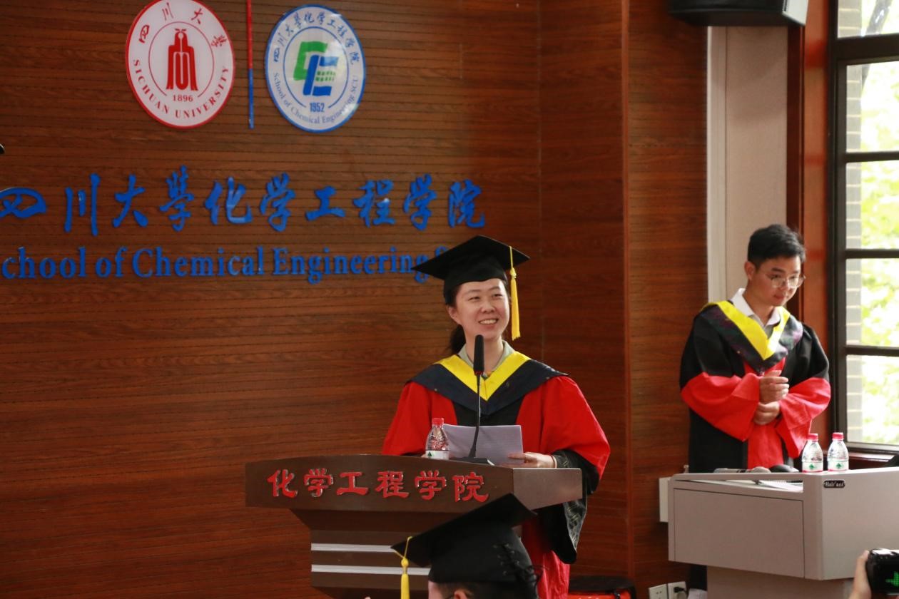 毕业本科生员工代表张雪发言。我们的本科生涯即将迎来终点,但这只是漫漫人生求知求学之路的开端。将要迈出校门的我们,应当胸怀“开放、包容、厚重、大气”的川大气质,努力成为堪当时代大任的化工新人,面对未来崭新的机遇和挑战。毕业研究生员工代表邱浪上台发言。毕业既是结束也是开始,我们都将奔赴下一个阶段。“海纳百川,有容乃大”,当初我们汇聚于此,现在也将奔赴五湖四海。作为川大化工人,未来的我们将更加努力,传承老一辈工作者的奋斗精神,更好的诠释川大人、化工人精神风貌和工作作风!在每个工作岗位做好川大榜样。
