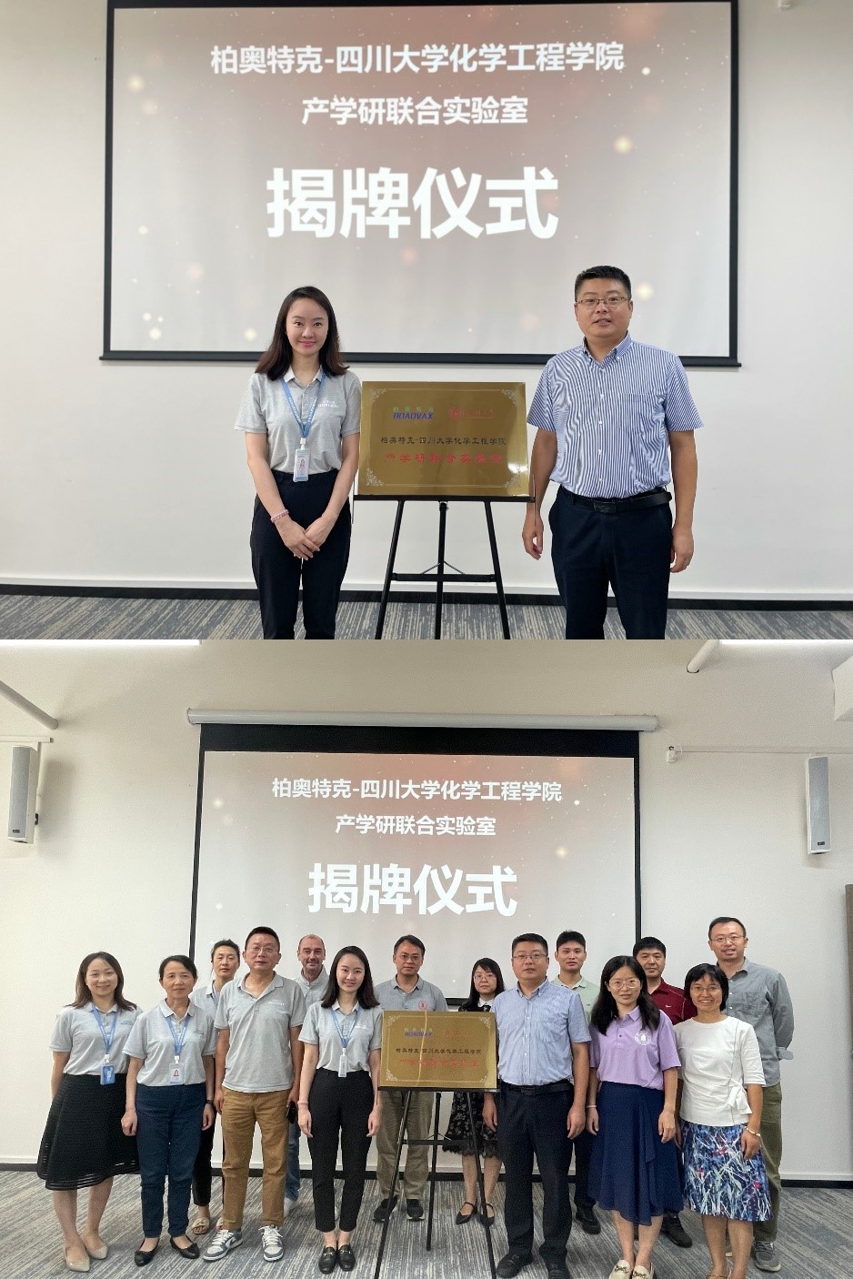 首先,在柏奥特克公司的工作人员主持下,共同举行了“柏奥特克-ballbet贝博官方网站产学研联合实验室”揭牌仪式。仪式上柏奥特克副总经理盛杨女士介绍了该公司的产品研发、成员组成、发展前景、价值理念等情况,在盛杨女士的介绍中,同学们了解到柏奥特克致力于创新型疫苗研究,拥有“无血清、无动物源性成分添加Vero细胞”、“基因工程传代细胞”、“人二倍体细胞”三大疫苗规模化生产技术平台,公司首款具有自主知识产权的重大创新型疫苗——冻干人用狂犬病疫苗(无血清Vero细胞)为国内独家产品,该产品运用多项新技术突破疫苗生产瓶颈,解决行业卡脖子问题。随后ballbet贝博官方网站李德富教授介绍了化工学院的科研情况、历史发展等情况。最后盛杨副总经理和李德富教授共同为“柏奥特克-ballbet贝博官方网站产学研联合实验室”揭牌,在场领导合影留念。