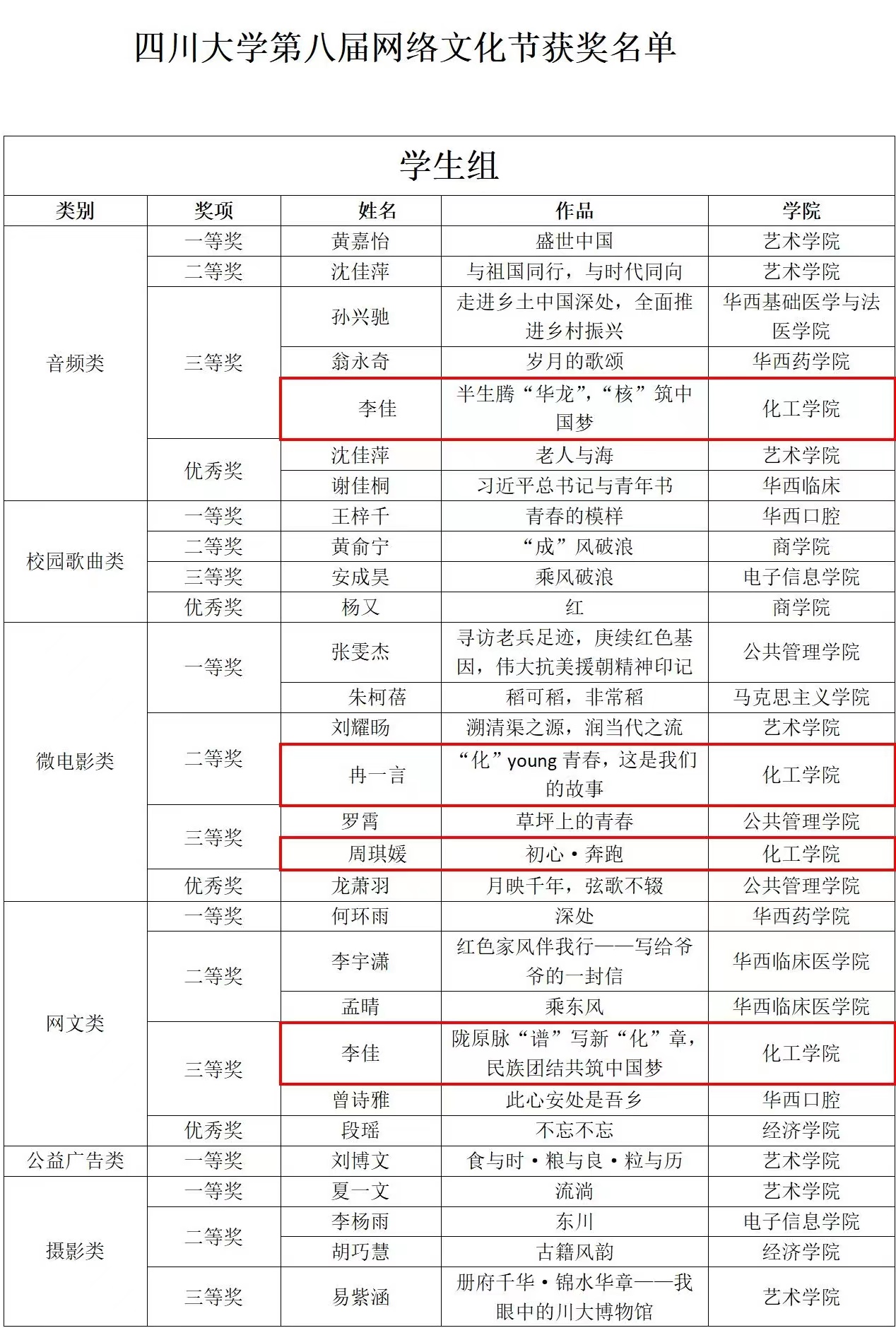 比赛获奖名单