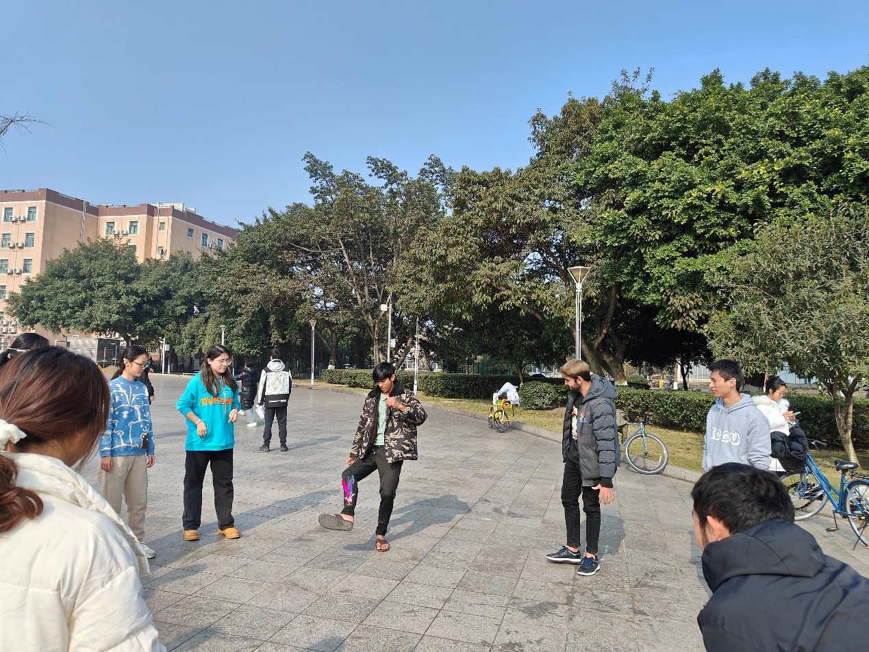 中午12点,参与活动的同学陆续来到青春广场。在活动开始之前,同学们或是自己拿起毽子开始踢起来,或者和三两好友,一起相互传递。活动正式开始之后,同学们10个人围成一个圈,相互踢毽子传递起来,职工与港澳台员工更是一起向其他同学展示他们的踢毽子学习成果,加入到队列当中。老师们也积极的和同学们互动起来,现场其乐融融。在这样一个或单人、或多人协作的踢毽子活动当中,同学和老师们一起踢动双脚,共同让毽子高高飞起。