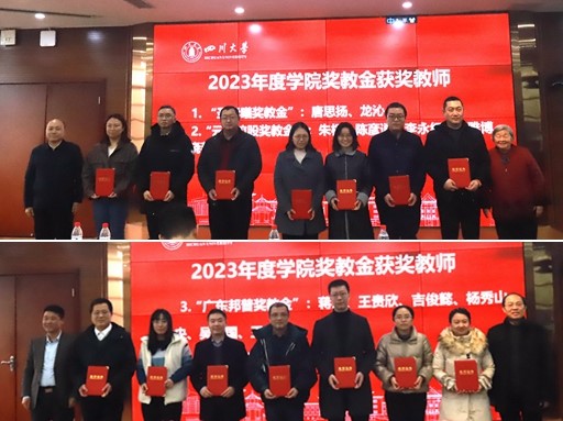 钟本和杰出教授、李军教授和学院领导一起向获得2023年度学院圣华曦奖教金、宜化奖教金、邦普奖教金、云图奖教金的16位教师颁发了荣誉证书。