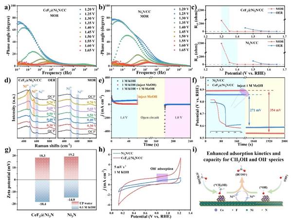 图2 (a) CeF3@Ni3N/CC和(b) Ni3N/CC在MOR中的原位Bode图;(c) OER及MOR中不同电位下的电荷转移阻力;(d) CeF3@Ni3N/CC在不同电位下OER及MOR的原位拉曼光谱;(e) CeF3@Ni3N/CC在1.4 V (vs. RHE),开路电压及1.0 V下的周期电化学测量;(f)在1 M KOH电解液中注入甲醇前后的开路电压;(g)在0.1 M KOH和纯水中的Zeta电位;(h) 1 M KOH中的CV曲线;(i) CeF3@Ni3N/CC表面甲醇和OH-的吸附-反应过程示意图。