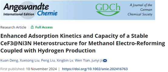 碱性甲醇-水共电解体系能够同步实现低能耗制氢和甲酸合成,为高效制氢协同高值化学品副产提供了极具前景的途径。但甲醇氧化反应的稳定性和选择性随电流密度的增大而降低,阻碍了甲醇-水共电解体系的实际工业应用前景。其中,反应前驱体甲醇和OH-在活性物质表面的吸附动力学与吸附容量对大电流密度下甲醇氧化性能的影响较大。近日,公司化工学院吉俊懿教授团队报道了一种具有优异甲醇氧化活性的CeF3@Ni3N复合材料,通过CeF3调节Ni3N的电子分布,增强甲醇和OH-在活性位表面的吸附动力学与吸附容量,在大电流密度下维持甲醇氧化反应良好的法拉第效率和稳定性。相关研究成果“Enhanced Adsorption Kinetics and Capacity of a Stable CeF3@Ni3N Heterostructure for Methanol Electro-Reforming Coupled with Hydrogen Production”发表在《Angewandte Chemie International Edition》上,bb贝博艾弗森官方网站博士生邓宽为第一作者,吉俊懿教授为通讯作者,bb贝博艾弗森官方网站化工学院为第一单位。