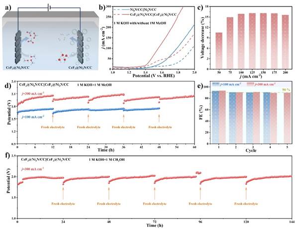 研究通过Ce元素的掺杂避免了氮化过程阵列结构的坍塌,而F元素在反应过程中从Ni(OH)2晶格内部缓慢迁出并生成CeF3,构筑了均匀分布的纳米级晶粒与丰富的Ni3N和CeF3异质界面。通过系列测试发现,与Ni3N催化剂相比,CeF3@Ni3N催化剂表面Ni3+OOH的生成速率更加迅速,并且对甲醇和OH-具有更快的吸附动力学和吸附容量,能够在表面反应消耗后实现快速补充,从而降低甲醇氧化反应的起始过电位、加速反应动力学,为大电流密度下甲醇氧化的高稳定性和高选择性提供了保障。因此,在100~500 mA cm-2的电流密度下,CeF3@Ni3N催化剂具有优良的法拉第效率和稳定性。在500 mA cm-2的电流密度下循环72 h(每12 h更换电解液),能够维持较高的法拉第效率(>90%)。与目前报道的甲醇氧化催化剂相比,具有更大的电流密度与更加优异的稳定性。由于CeF3@Ni3N电极具有优异的甲醇氧化和析氢性能,以CeF3@Ni3N催化剂为阴、阳极组装了流动型甲醇-水共电解装置,能在工业生产要求的电流密度(300 mA cm-2)下长时间稳定运行,实现同步高效制氢和甲酸合成的目标。该工作为甲醇氧化耦合电解水制氢的工业化应用提供了有价值的探索与实践。