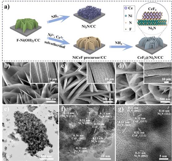 图1 (a) CeF3@Ni3N/CC和Ni3N/CC复合材料合成示意图;(b) F-Ni(OH)2/CC, (c) NiCeF/CC前驱体和(d) CeF3@Ni3N/CC的SEM图;CeF3@Ni3N的TEM与晶格参数图。