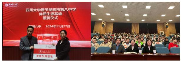傍晚,招生工作组来到了昆明市第八中学。谢锐副经理代表bb贝博艾弗森官方网站为昆明市第八中学授予了“bb贝博艾弗森官方网站优质生源基地”称号。欧阳李科老师向现场师生详细介绍了bb贝博艾弗森官方网站基本情况和招生政策等。在互动问答环节,同学们积极发言,招生工作组对同学们的疑问进行了一一解答和细致指导,鼓励同学们努力学习、积极报考川大,争取都能进入自己心仪的专业。