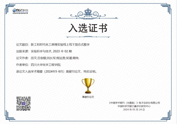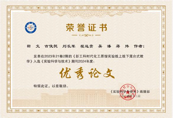 化工原理实验教研室自2020年起开展线上线下混合式实验教学实践以来,不断总结、改进和提升,建成了四川省混合式一流课程一门,团队教师田文先后获bb贝博艾弗森官方网站教师教学创新竞赛一等奖,四川省第四届教师教学创新大赛三等奖。团队教师每年带领川大化工员工连年获得全国化工实验大赛一等奖等好成绩。优秀论文不仅是对团队教学工作和总结的肯定,也是对我们实验教学和研究工作的鼓励和鞭策。