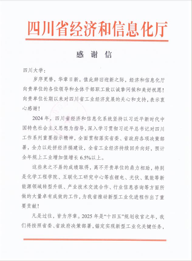 近日,学院收到四川省经济和信息化厅发来的感谢信,感谢学院在锂电、光伏、氢能等新能源领域为四川省经济社会发展、新型工业化进程所作的贡献。