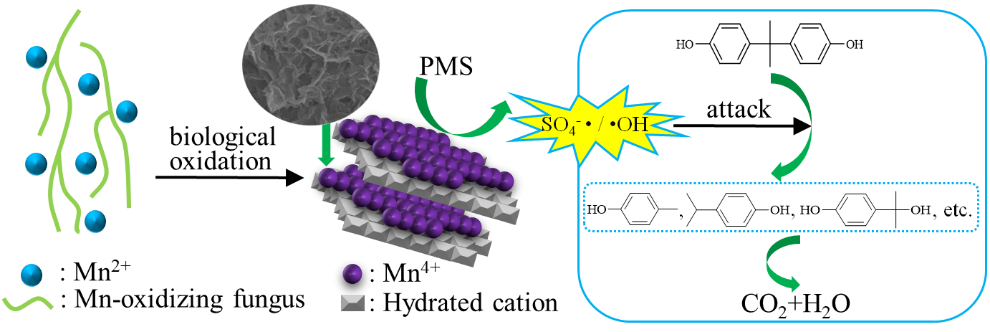 该课题组利用真菌在生长代谢过程中产生的酶将正二价锰离子氧化为高价态的锰氧化物,获得了薄层堆积状的生物锰氧化物δ-MnO2。利用其作为催化剂活化过硫酸盐产生SO4-·自由基降解双酚A,研究发现400℃热处理后的生物锰氧化物表现出较高的的催化活性;在优化的条件下,可实现溶液中的双酚A完全去除,溶液中的TOC去除率可达到97%。