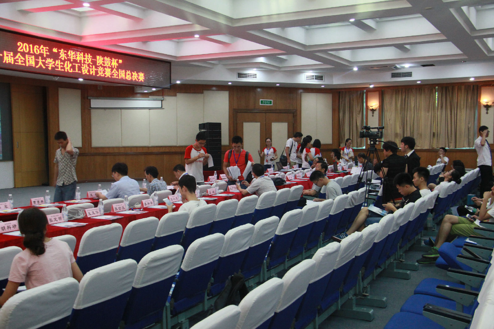 在第一轮答辩现场以及总决赛的现场都能看见竞赛组志愿者的身影。他们负责现场的计时、举牌、服务队员饮水问题、评委统分表的收发、给现场评委提问递话筒。志愿者杨再宇说到:“第一轮答辩时我负责的是举倒计时的提示牌,这份工作看起来很简单但也是有讲究的,你需要兼顾到台上的队员、台下的评委以及观众,所以要考虑好该如何举好提示牌。在这个过程中让我明白了简单的事情不代表容易,以后在生活学习中也应认真对待每一件事情。第二天的决赛现场更是让我学到了很多在课本中学不到的专业知识,更让我见识到了不同大学的评委以及员工的风采,让我对化工有了更加深刻的见解。”