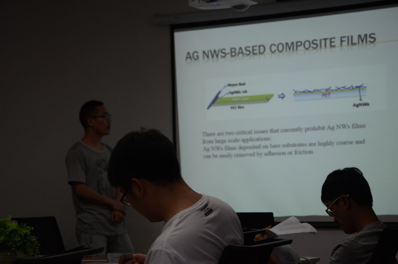 毕晓峰作为第一报告人,主要讲解了银纳米线导电薄膜的制备和优化。