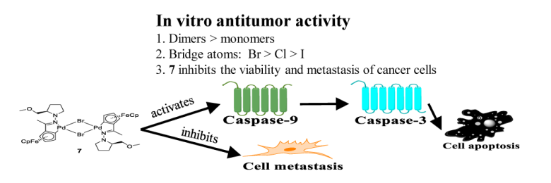 前期,赵刚教授课题组经过反复试验,成功制备出了具有平面手性的二茂铁环钯化合物。这类化合物具有良好的抗肿瘤活性。在构效关系研究的基础上在进行了抗肿瘤作用机制探究,发现部分平面手性二茂铁环钯化合物能高效地杀伤癌细胞(IC50值低于顺铂的1/10),并显示出与顺铂不同的作用机制,它们能通过诱导caspase相关蛋白表达促进细胞凋亡,并能在一定程度上抑制肿瘤细胞迁移。部分成果发表于Organometallics(37, 2018, 1103-1113)(博士研究生龚贵东为第一作者)和Journal of Organometallic Chemistry(871, 2018, 1-9)(2016级硕士研究生周洋洋为第一作者)。