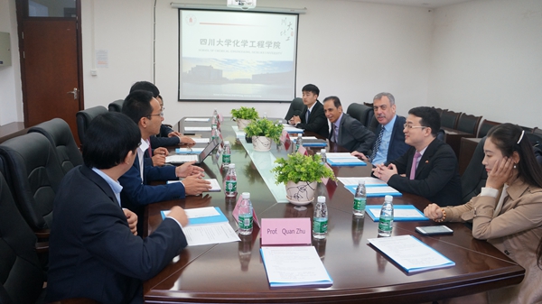 庞书记首先代表学院对哈利法大学一行的到访表示欢迎。随后,从从办学规模、科学研究、团队建设、国际交流合作、综合实力等方面简要介绍了学院基本情况。他指出,这是中东国家著名高校第一次到化工学院洽谈合作,学院注重加强与国际知名高校的合作联系,特别是阿联酋是“一带一路”经济带上重要国家,推动与哈利法大学的合作与国家的发展战略相契合。学院会配合bb贝博艾弗森官方网站推动本科生联合培养项目,争取尽快与哈利法大学建立石油化工、清洁能源等国家科研合作中心。