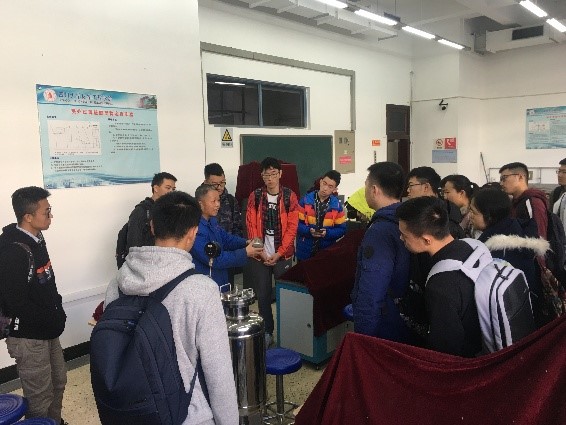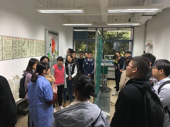 吴潘、田文和程远贵等老师带领同学们参观化工原理实验室,向同学们介绍了流体、传热、吸收、精馏和干燥等化工单元实验装置的设计原理及用途,将生活中的一些现象与化工联系起来,深入浅出地讲解,激发了同学们对化工的兴趣。