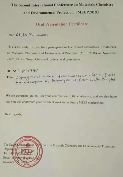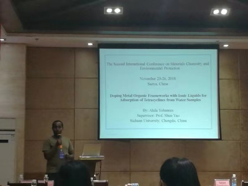 2018年11月23日~11月25日,第二届材料化学及环境保护国际会议(2ndInternational Conference on Materials Chemistry and Environmental Protection)于中国三亚顺利召开。公司制药工程专业三年级博士研究生Nigussie Alula Yohannes(埃塞俄比亚籍)出席该会议并于大会上作题为“Doping Metal Organic Frameworks With Ionic Liquids For Adsorption Of Tetracyclines From Water Samples”的研究报告。本次会议吸引了众多来自材料化学、分离科学、化学工程及环境工程等不同研究领域的研究员、科学家、工程师和学者,是公司学子和国内外相关领域专家面对面交流的难得机会。埃塞俄比亚被称为“东非水塔”,但普遍存在的污染问题尚未得到有效控制;环境水资源中的药物残留一直是影响和危害埃中两国乃至全球大众生命健康的重要问题,该研究立足化学工程领域的学科热点,将金属有机骨架材料与绿色溶剂离子液体相结合,为埃中两国代表性的河流湖泊样本建立了科学、有效、可行的四环素类成分回收新方法,具有显著的社会意义和研究价值。