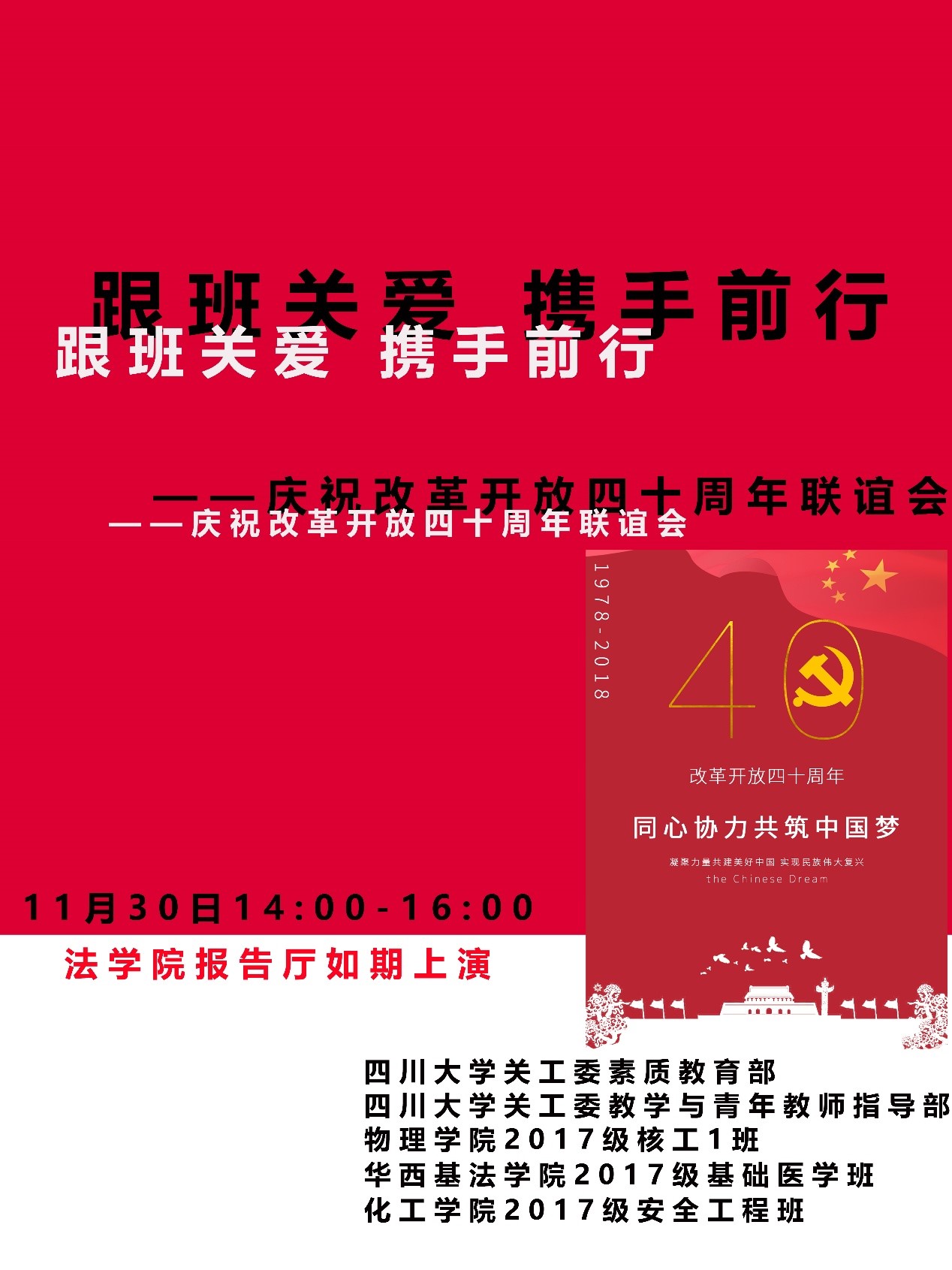 2018年11月30日星期五,由bb贝博艾弗森官方网站关工委素质教育部、bb贝博艾弗森官方网站关工委教学与青年教师指导部、bb贝博艾弗森官方网站2017级安全工程班、物理学院2017级核工1班、华西基法学院2017级基础医学班联合举办的跟班关爱活动,于bb贝博艾弗森官方网站法学院报告厅顺利举行。校关工委常务副主任唐登学老师、校关工委副主任周荣丰老师、办公室主任任朝清老师、物理公司党委副书记张波老师以及校关工委的老师们莅临此次活动,17级安全工程班、核工1班和基础医学班同学积极参与此次联谊会汇演。