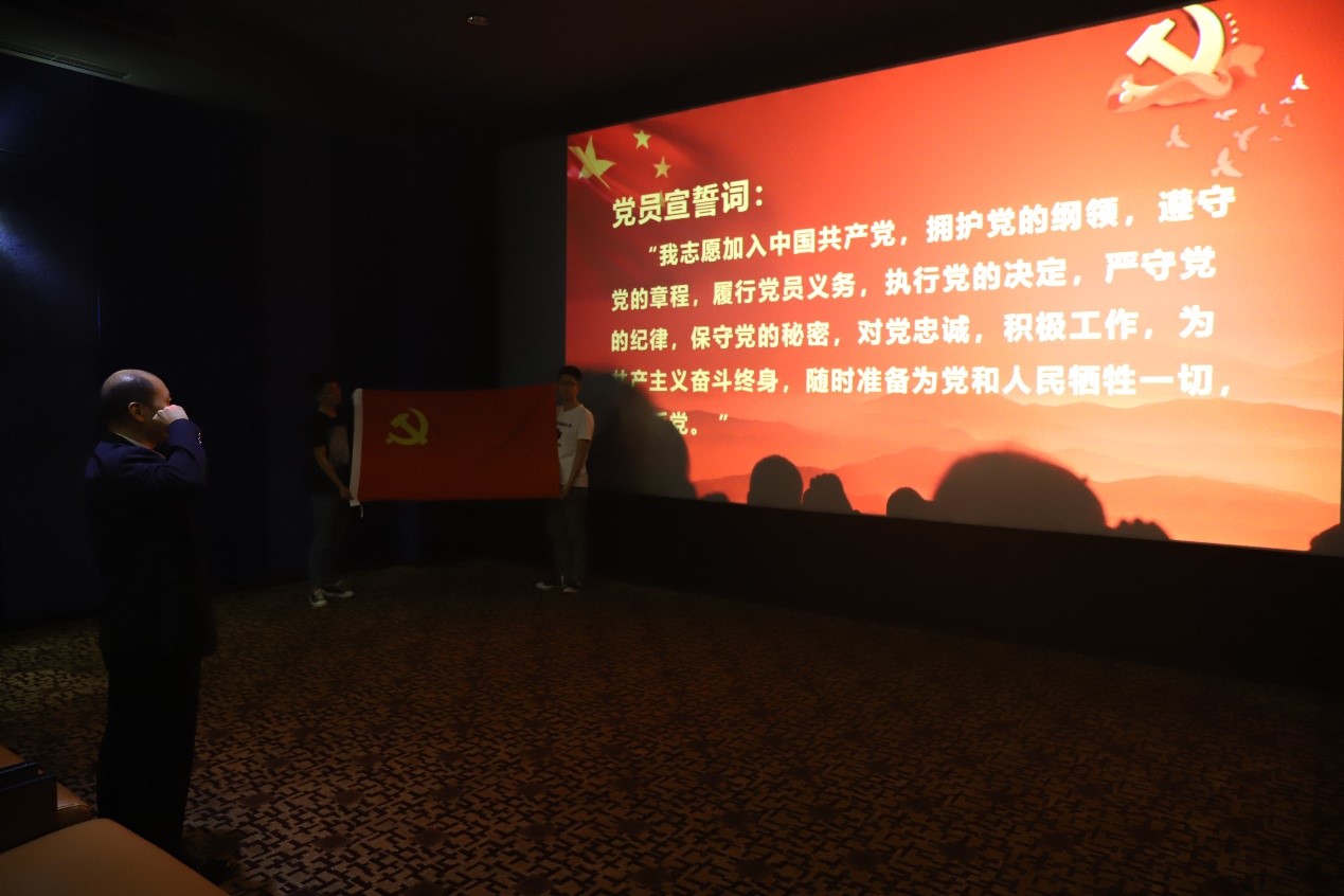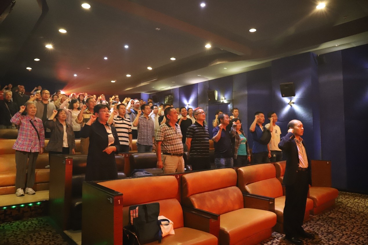 观影前,全体党员在在公司党委副书记、纪委书记李天友同志的带领下面向党旗重温入党誓词。“我志愿加入中国共产党……”,面对鲜红的党旗,同志们高举右拳,字字铿锵,重温入党誓词,响彻在每一个影厅,让“忠诚、干净、担当”真正入脑入心。在重温誓词的时候,每一个党员都在回头看看自己入党之后走过的“路”,找出其中的不足,不忘初心、牢记使命,抬起头来向优秀的党员学习,争做合格的共产党员。