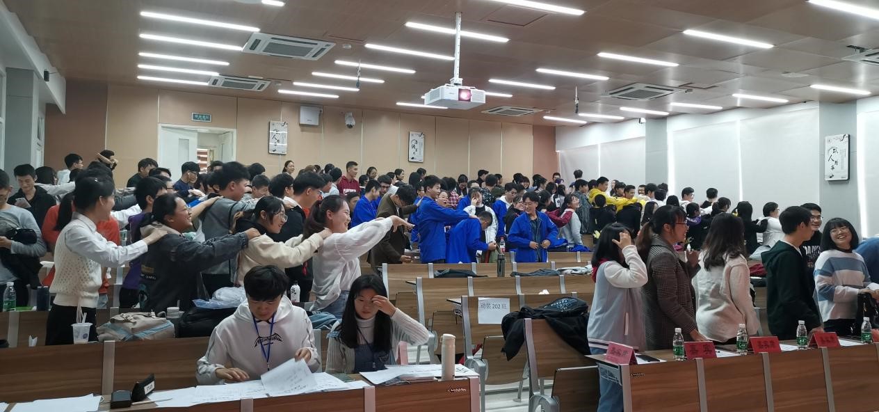 中场放松环节让大家互相揉揉肩,也让整个会场的氛围变得轻松,而计分的工作人员还在紧张的计算着前几个班级的分数,初赛活动有条不紊地进行着。