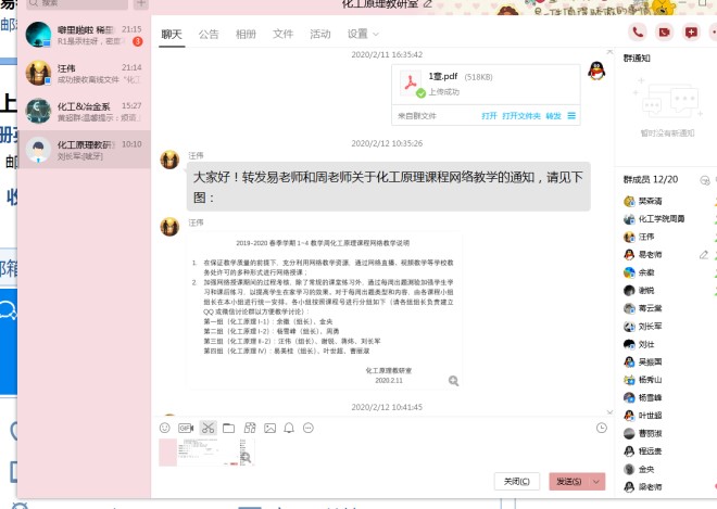 为了贯彻实施“停课不停学,停课不停教”的精神,保障新学期化工原理网络授课的顺利开展,2020年2月12日和2月28日,公司化工原理教研室老师分别通过QQ群进行了网络教研活动。