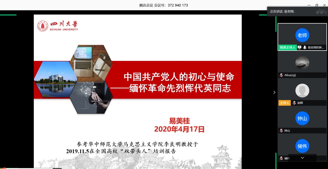 为深入贯彻实施习近平总书记在党的十九大报告中提出的“不忘初心,牢记使命”主题教育”,本次党组织生活,易美桂同志给党员同志们上了一堂以《中国共产党人的初心与使命——缅怀革命先烈恽代英同志” 》为题的党课。易老师的报告从介绍恽代英生平事迹开始,以“恽代英的初心与使命是什么?”、“恽代英是怎样践行初心与使命的?”、“我们应该向恽代英学习什么?”三个问题为主线,生动且深刻阐释了中国共产党人如何践行初心与使命。