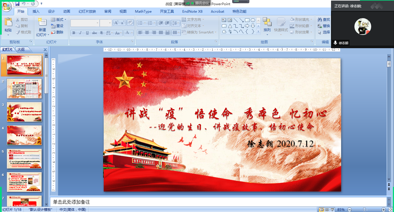 2020年7月12日下午16点,化工学院研究生第六党支部活动——微党课如期举行,会议采取线上的方式并由党支部书记徐志朗同志主持。