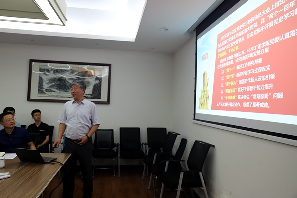 庞国伟书记重点汇报了公司党史学习教育开展情况。他说,党史学习教育开展以来,公司党委认真学习贯彻习近平总书记在党史学习教育动员大会上的重要讲话精神,全面落实公司党委的安排部署,在学校第五指导组的悉心指导下,研究制定学院实施方案,从严从实做好规定动作,取得了显著成效。一是以“四个一”做好工作研究部署;二是以“四个学”推进专题学习走深走实;三是以“两个融入”加强时代新人政治引领;四是以“两层培训”抓好干部骨干能力提升;五是以“十项清单”解决师生“急难愁盼”问题。接着,庞书记从“拓宽‘思想维度’,用党史学习教育讲好当代化工故事;发挥‘榜样力度’,用党史学习教育弘扬新时期化工精神;提升‘价值高度’,用党史学习教育涵育时代化工新人”三个层面介绍了学院开展党史学习教育的特色做法。他讲到,下一步,学院将在公司党委的领导下,继续抓好党史学习教育,推动党史学习教育走深走实、入脑入心;继续做好支部书记讲党课和支部专题组织生活会等重点工作;对照重点事项清单,着力为师生办实事;凝练总结学院好的经验和做法,提升党史学习教育品牌效应;通过党史学习教育,涵养时代化工新人,促进公司党建和事业发展开新局,全力助推一流团队建设上新台阶,以学习教育的实际成效庆祝中国共产党成立100周年。