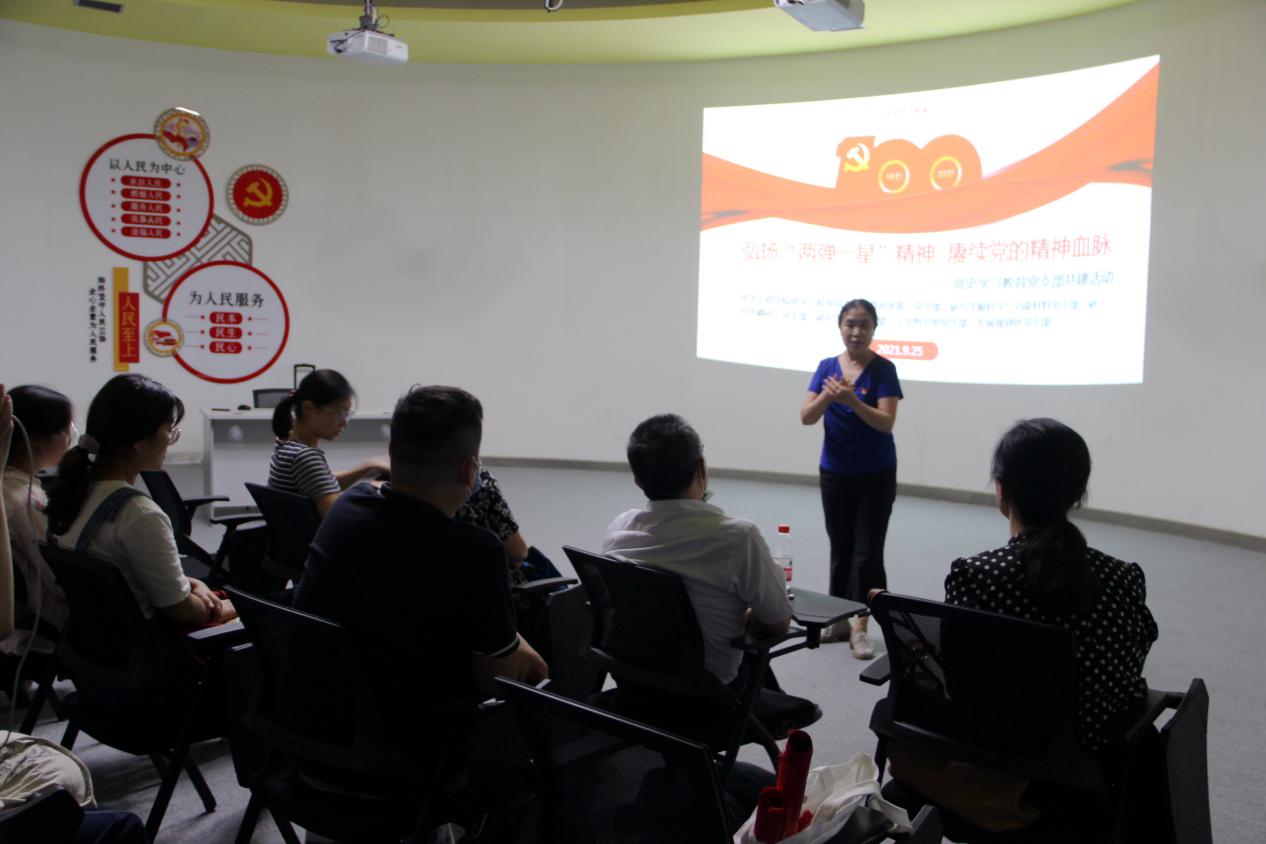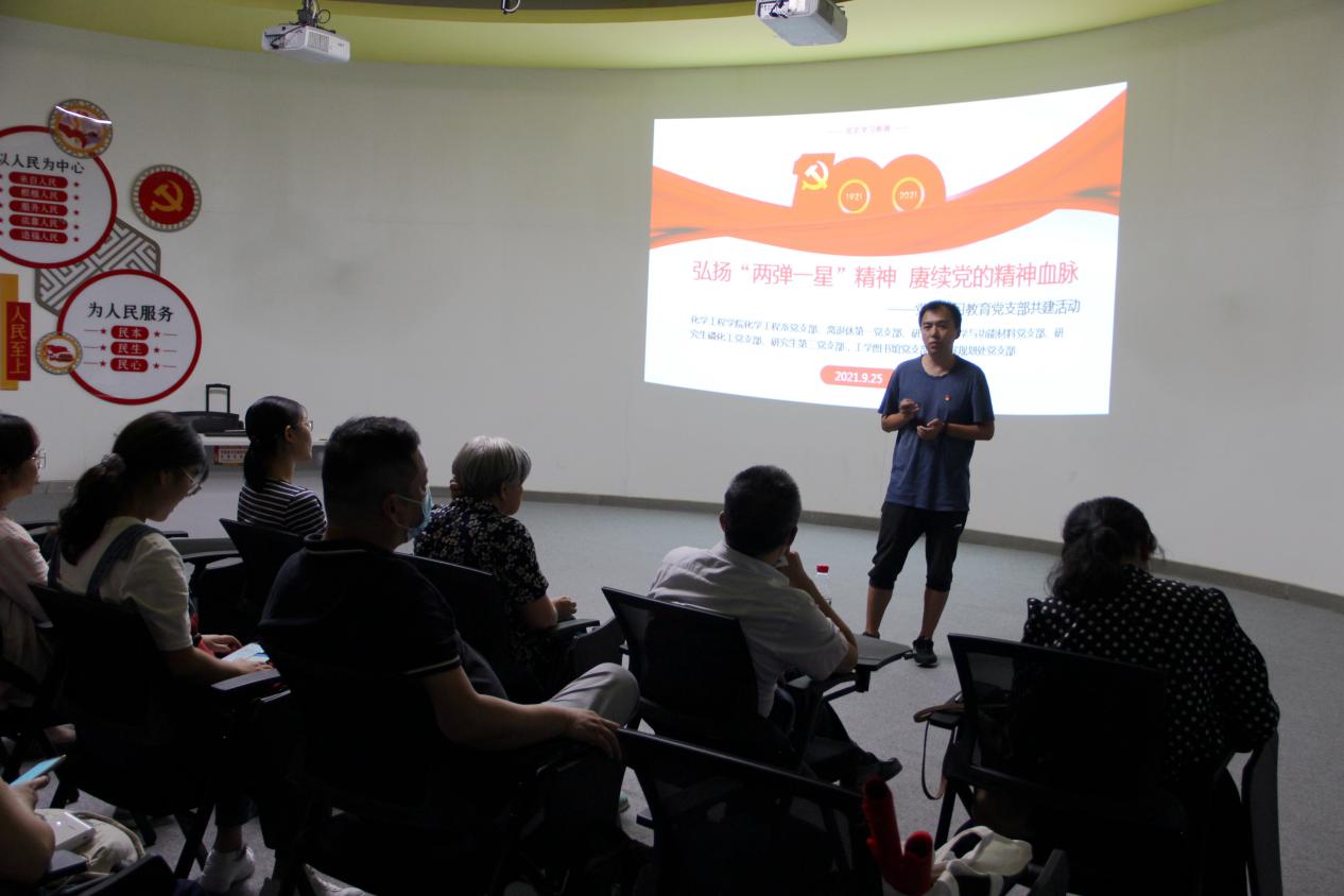 7个党支部的党员同志们在科技馆讲解员的带领下,参观了这座国内唯一的“两弹一星”主题科技馆。师生党员们认真观看了导弹展区、航空航天展区、卫星与信息展区、核武器与核科技展区、卫星与空间信息技术展区的展览,通过实物、图片、视频等详细了解了我国航空航天、核武器的发展历程。在科技馆三楼“两弹一星”功勋人物展区,钱学森、邓稼先、郭永怀、于敏、孙家栋、任新民等“两弹一星”元勋在艰苦复杂条件下,做民族脊梁、献身“两弹一星”事业的英雄事迹和所形成的“热爱祖国、无私奉献,自力更生、艰苦奋斗,大力协同、勇于登攀”的“两弹一星”精神深深地感染和激励着现场参观的师生党员们。