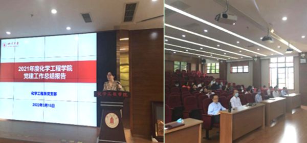 首先,党支部书记谢锐同志向全体党员做了化工系党支部2021年度党建工作总结报告,报告内容包括党支部推动事业及党团工作发展情况、党支部工作创新做法及主要成效、党支部现存问题和改进工作思路等。谢锐书记在总结中说到,党支部的成绩源自每位党员同志的贡献,今后应该以更高标准、更有效举措开辟党建工作的新篇章。