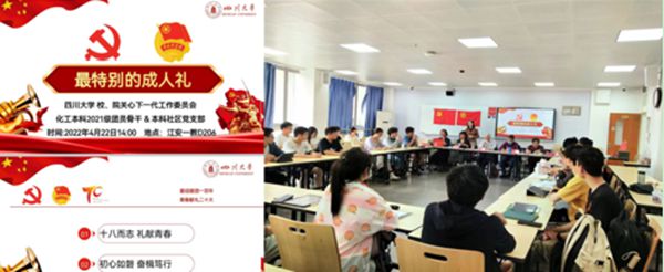 作为化工青年,我们的十八岁,都有一个共同的追求——“提交入党申请书”。“清澈的爱,只为中国。”这句由“00后”戍边烈士陈祥榕曾写下的令无数人为之泪目的深情表白,他的18岁是如此的绚烂多彩!是如此的炽热坚韧!伴随着朴实又温情的话语,我们同教导员李川娜老师和刘蓉生老师一起,回顾着老教师党员他们18岁艰苦奋斗的知青岁月,在与国家同甘共苦的岁月中加入中国共产党,这一段经历刻骨铭心,有着无法抹去的记忆久久萦绕于心间。2022年化工青年也迎来了我们自己的18岁,或许刚刚到,或许还未走远。刚满18周岁1天的学习委员陈飖曲,郑重的向本科社区党支部提交了入党申请书,并在活动现场分享到“我的十八岁,是独一无二的十八岁,我想申请入党,永远跟党走。坚韧前行,勇挑重担,在时代的洪流中彰显青春的蓬勃力量;不惧风雨,砥砺前行,在大是大非面前交出时代的合格答卷”。满18周岁2周的班长兼副团支书付学舟,提到“生逢盛世,乃我们之幸;于盛世中奋斗,乃我们之责。我怀着崇高的敬意,郑重地向党组织递交入党申请书,这是我人生历程中十分庄严神圣的事情,我必将用一生践行全心全意为人民服务的宗旨,争取早日加入中国共产党”。满18周岁1个月的班长兼副团支书程甲,谈到“我于2022年4月1日向党组织提交入党申请书,这一天是一个特殊的日子,正好是我的生日,我把提交入党申请书作为送给自己的生日礼物。就在这一天,我在心里种下一颗红色的种子,与信仰对话,逐梦筑梦圆梦,努力成为党的优秀后备军”。随后大家纷纷憧憬并接力述说着自己的18岁“我的十八岁,是奋勇担当的、是朝气蓬勃的、是志愿先行的、是建功立业的,是……”